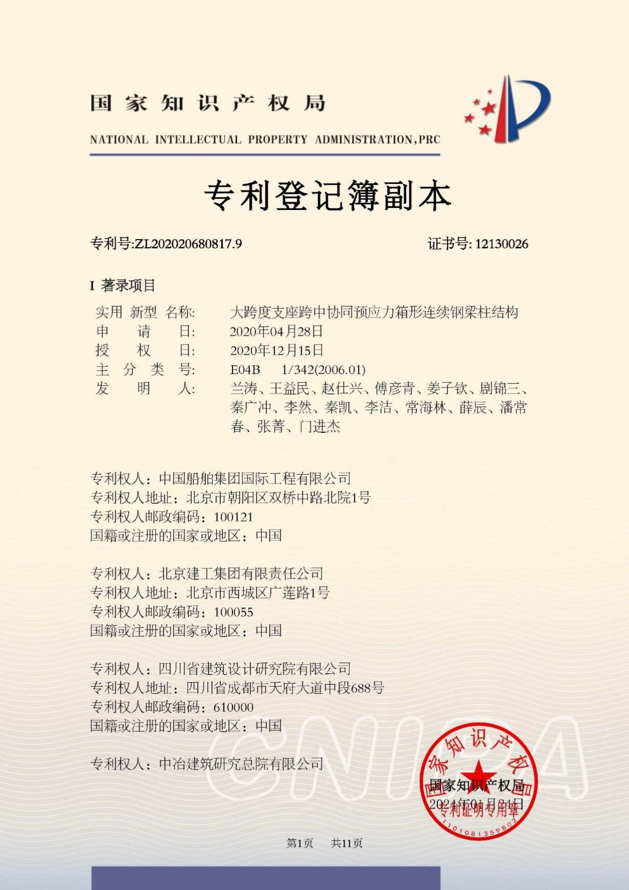 今年6月,國家知識產權局公布第二十五屆中國專利獎授獎決定,由中船集團旗下中船國際工程主導申報的專利《大跨度支座跨中協同預應力箱形連續鋼梁柱結構》(專利號:ZL202020680817.9)榮獲本屆中國專利銀獎。該獎項由國家知識產權局與世界知識產權組織聯合設立,是我國專利領域的最高榮譽。今天,讓我們走進中船國際工程鋼結構工程設計與研發團隊,聆聽他們的奮斗故事。