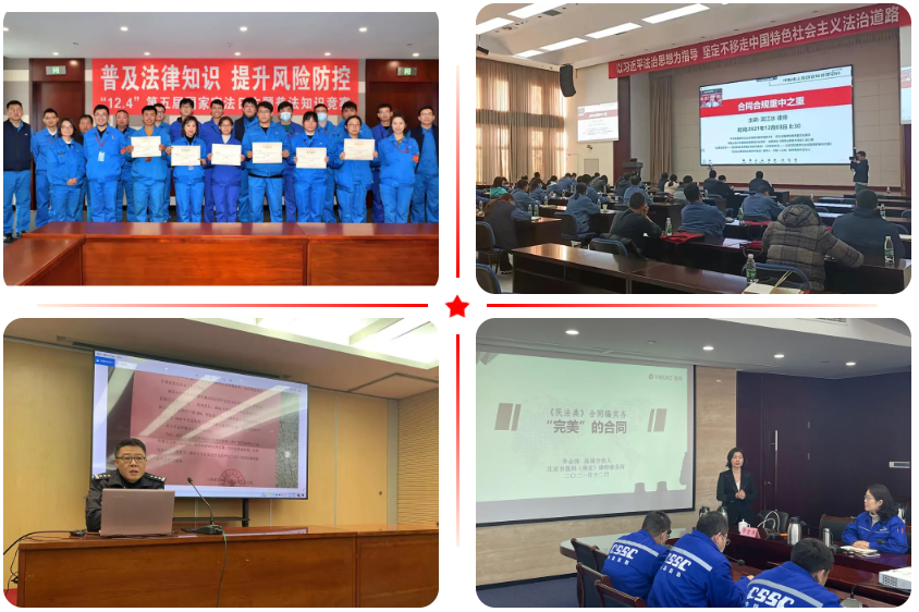 ▲ 江南造船、中船九院、重齒公司、河柴重工、江淮重工、七〇八所、七〇九所、七一六所等單位通過線上與線下相結(jié)合的方式開展法律知識競賽;七一七所、七二二所等單位拍攝制作普法微視頻;中船澄西、中船財務(wù)、中船投資、物資公司、各平臺型上市公司、中船綠洲、中船風電、漢光重工、長江科技、七一〇所、七一一所、上船院等多家單位舉辦專題法治講座;七六〇所舉辦民法典熱點問題交流沙龍;八院組織業(yè)務(wù)部門重點崗位人員旁聽庭審。