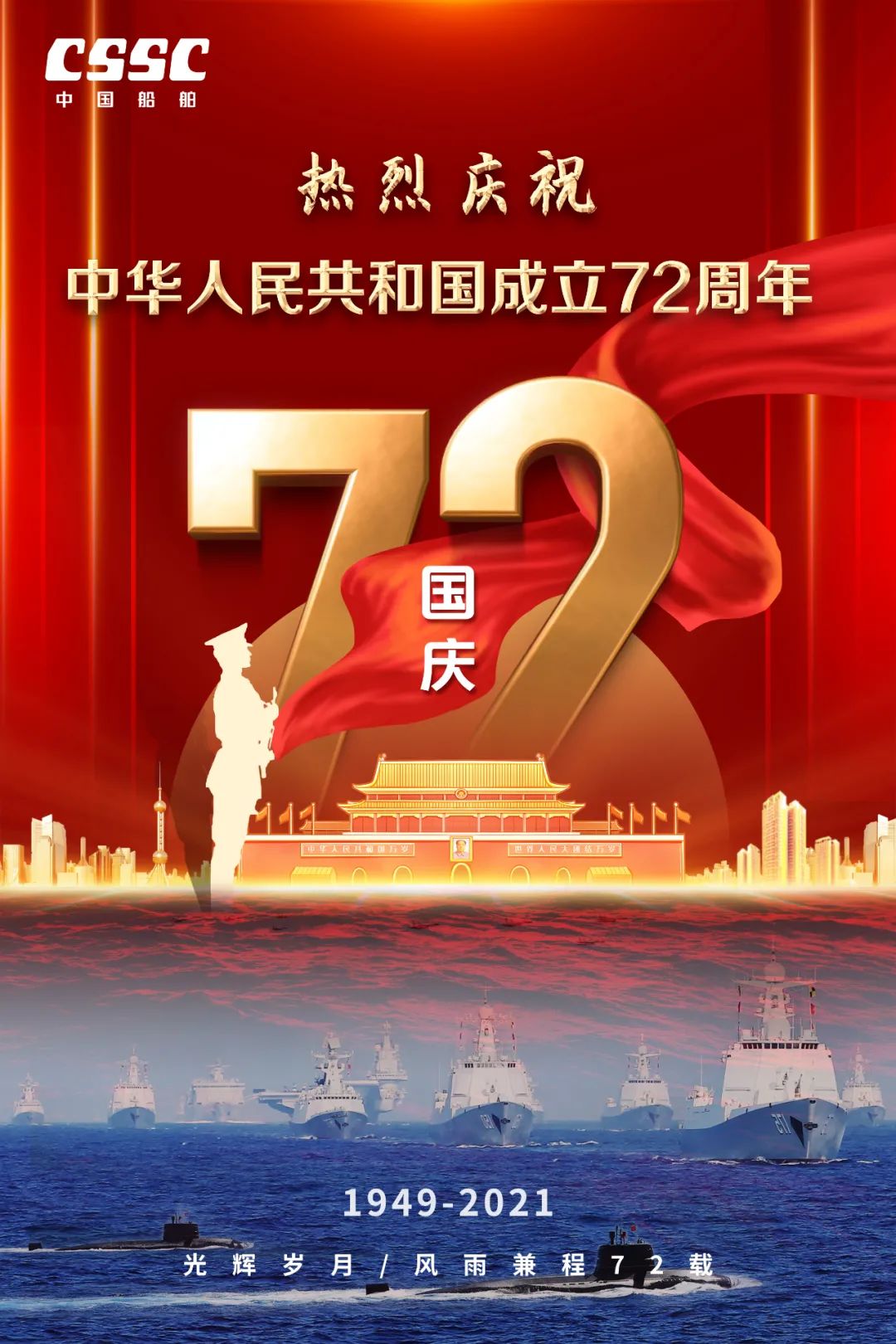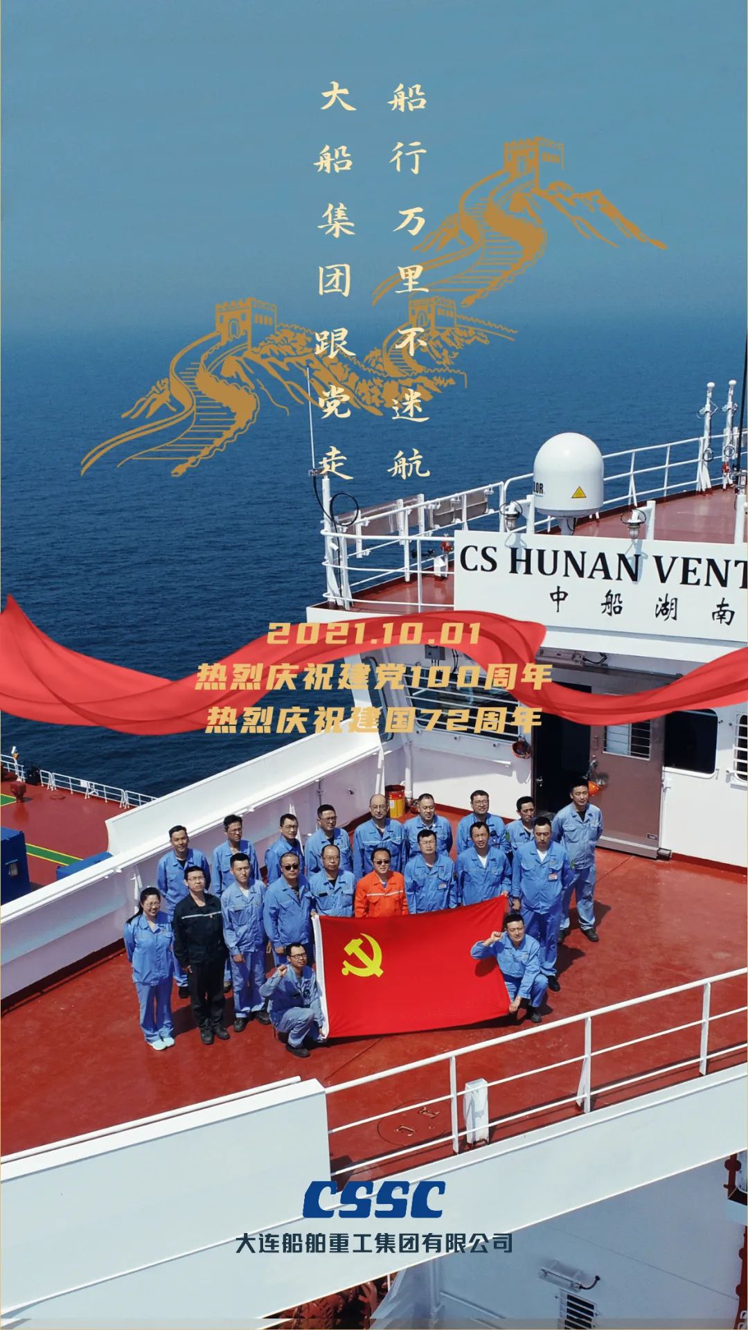 今天,我們迎來新中國72周年華誕。作為我國海軍裝備建設的主力軍,中國船舶大船集團將不忘初心,牢記使命,堅定貫徹海洋強國、制造強國、科技強國國家戰(zhàn)略,聚焦主責主業(yè)、聚力興裝強軍,為實現(xiàn)中華民族偉大復興的中國夢而不懈奮斗。