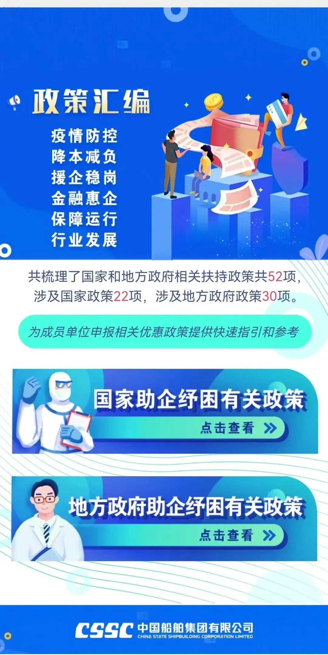 今年新冠疫情發(fā)生以來(lái),為支持企業(yè)應(yīng)對(duì)疫情防控、加快復(fù)工達(dá)產(chǎn),國(guó)務(wù)院、相關(guān)部門(mén)、相關(guān)地方政府出臺(tái)了一系列助企紓困政策。集團(tuán)公司對(duì)這些政策進(jìn)行了梳理,共涉及相關(guān)支持政策52項(xiàng)(其中,國(guó)家支持政策22項(xiàng)地方支持政策30項(xiàng)),供成員單位查閱參考。