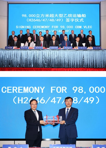 11月2日,中國船舶集團(tuán)旗下江南造船(集團(tuán))有限責(zé)任公司承建的,山東海洋集團(tuán)下屬太平洋氣體船4艘超大型乙烷運輸船項目簽約儀式在上海舉行。中國船舶集團(tuán)黨組副書記、總經(jīng)理楊金成,黨組成員、副總經(jīng)理孫偉,山東海洋集團(tuán)黨委書記、董事長姜國棟,黨委委員、副總經(jīng)理于冰出席儀式。