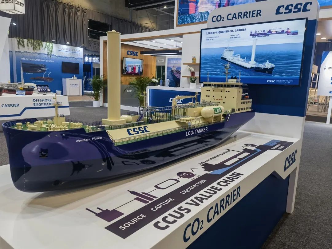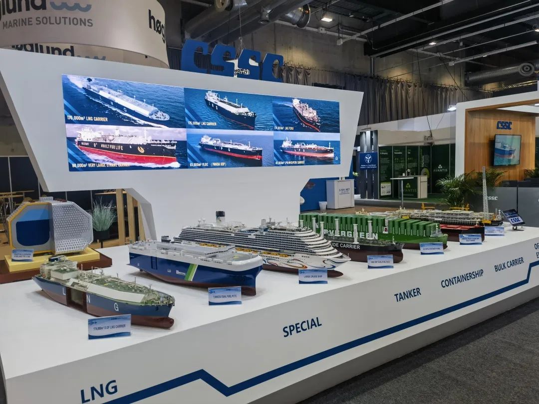 本次展會,中國船舶集團積極踐行“走出去”發(fā)展戰(zhàn)略,緊盯目標(biāo)市場特點和需求,重點展示了近年來船舶海工及動力機電產(chǎn)品在綠色、低碳、環(huán)保方面取得的最新進展和相關(guān)成果,包括全球首制7500立方米液態(tài)二氧化碳運輸船、17.4萬立方米大型LNG運輸船、7000CEU雙燃料汽車滾裝船、23000TEU超大型雙燃料集裝箱船、21萬噸氨燃料散貨船、30萬噸級FPSO、全球首艘10萬噸級智慧養(yǎng)殖工船,以及 12X92DF雙燃料低速機、LNG供氣系統(tǒng)、船用碳捕捉系統(tǒng)等。集團公司展臺吸引了眾多國內(nèi)外知名船東、船級社、設(shè)備廠商等到訪觀摩,交流了當(dāng)前市場熱點并探討了未來合作機遇。