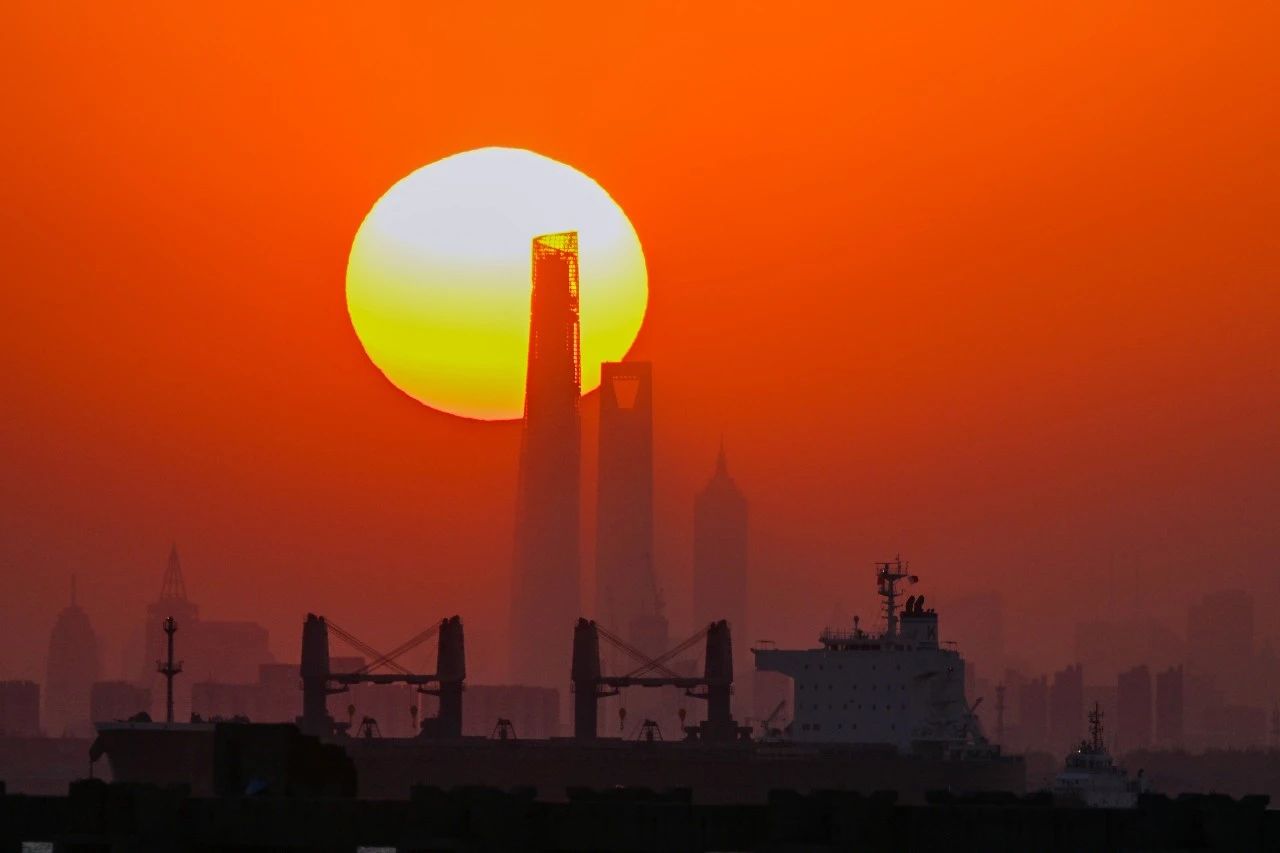 從距離陸家嘴33公里遠的橫沙島上遠眺“三件套”,夕陽從“三件套”穿過,此時一艘船駛入畫面,與夕陽形成近中遠三景。