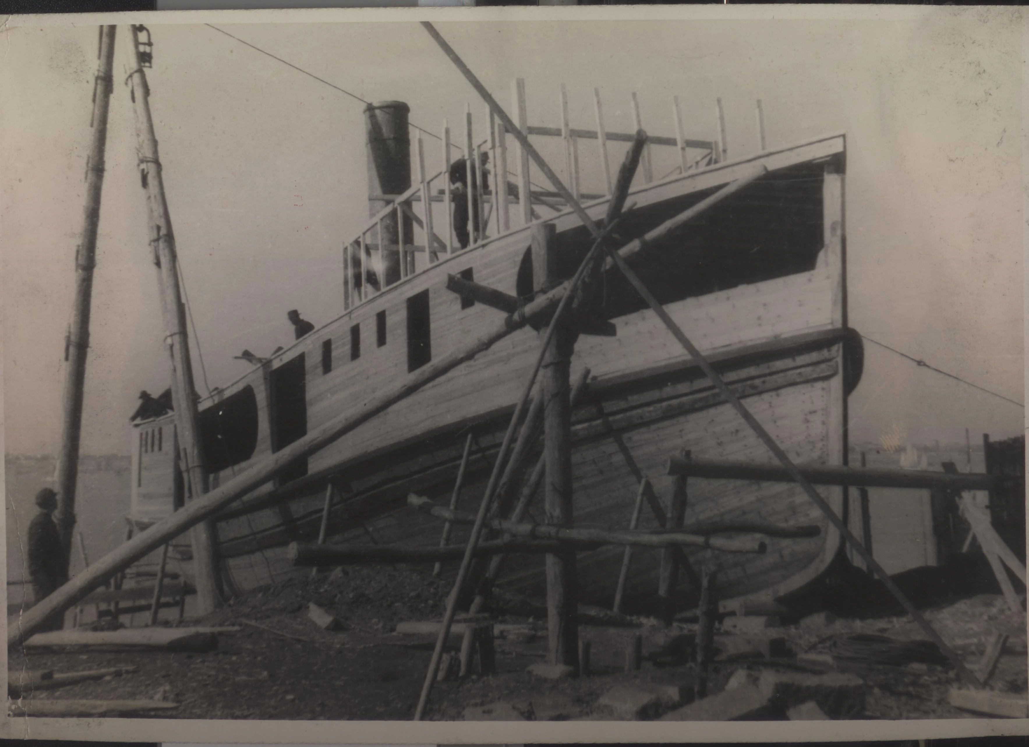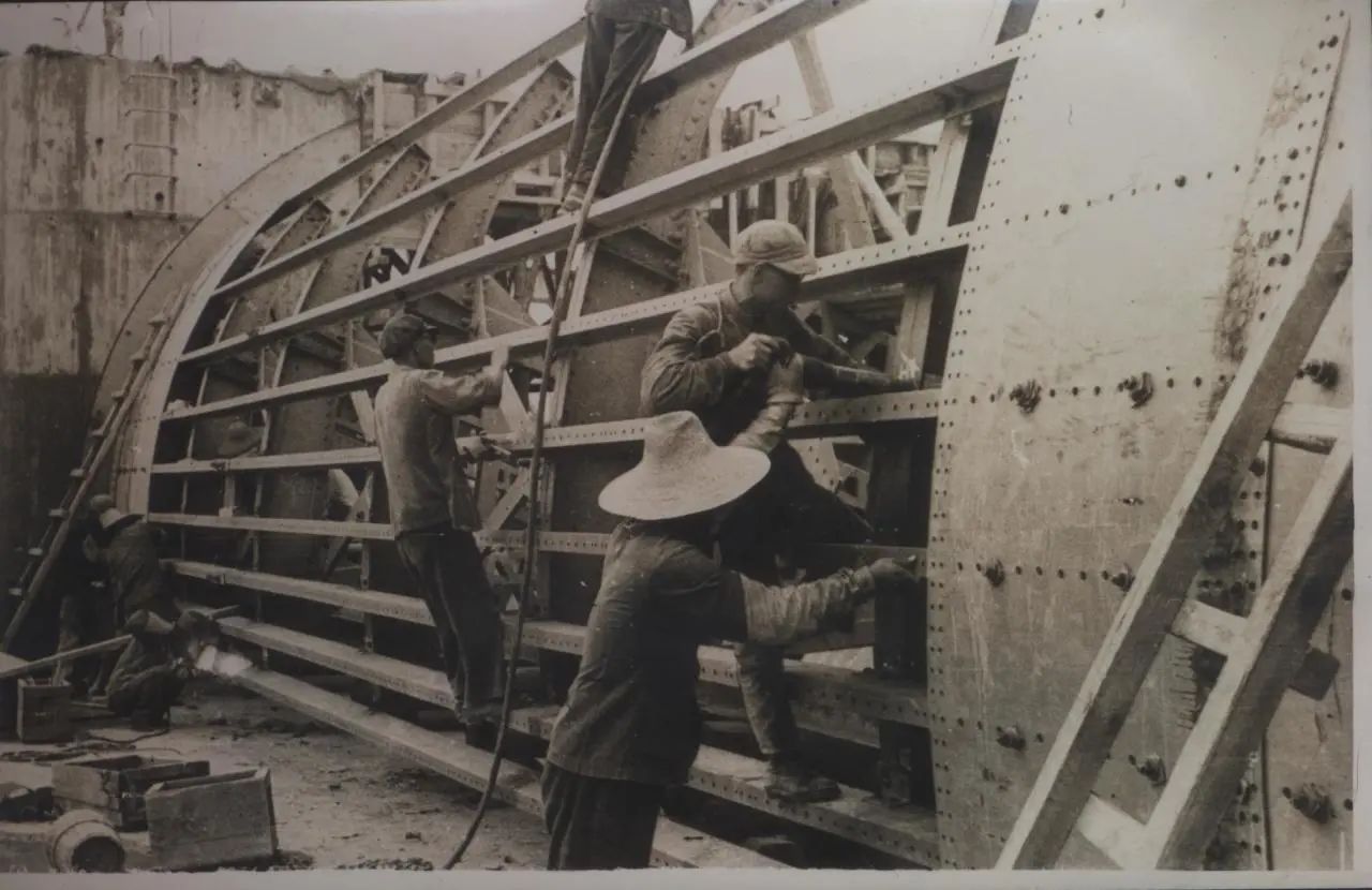 1934年武漢,上世紀(jì)30年代,武昌造船成立之初,工人們以手工作業(yè)“敲敲打打”形式開(kāi)展修造船業(yè)務(wù)。修造的船只大多為100~300噸、鋼肋骨與木殼結(jié)構(gòu),僅有少量是鋼鉚接船體。建造的船只只能在長(zhǎng)江上航行跑跑運(yùn)輸。為了生存和救國(guó),船廠還建造一些農(nóng)用機(jī)械器具、槍支,以輔助民生、支援抗日。