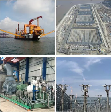 左上:裝有七一一所傳動(dòng)裝置的挖泥船;左下:816壓縮機(jī);右上及右下:浙石化火炬航拍及近景圖。