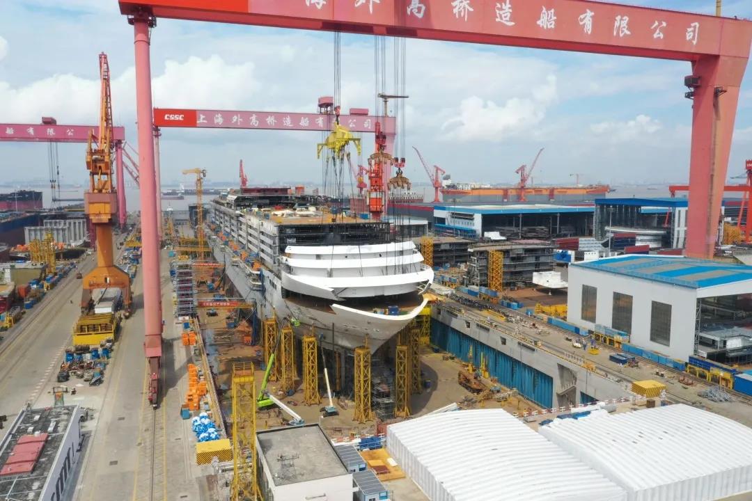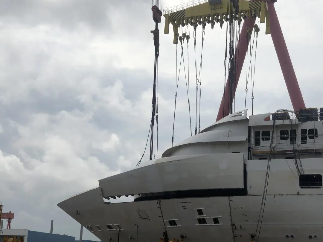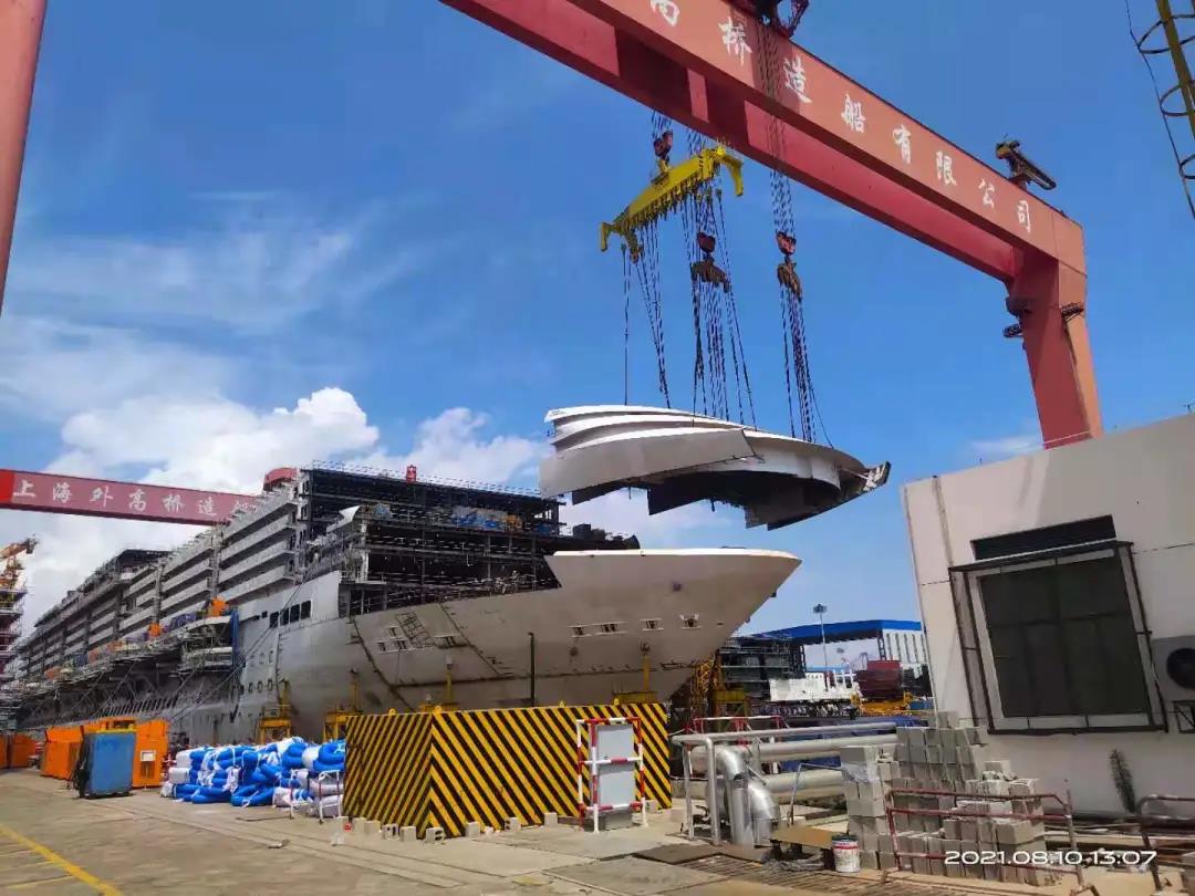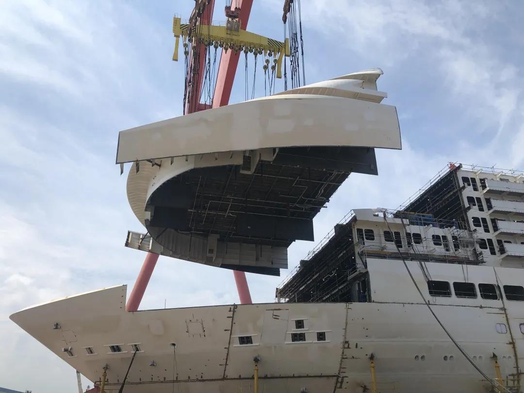 這標志著國產首制大型郵輪正式開啟艏部吊裝模式,9月份將實現全船結構貫通這一里程碑節點。