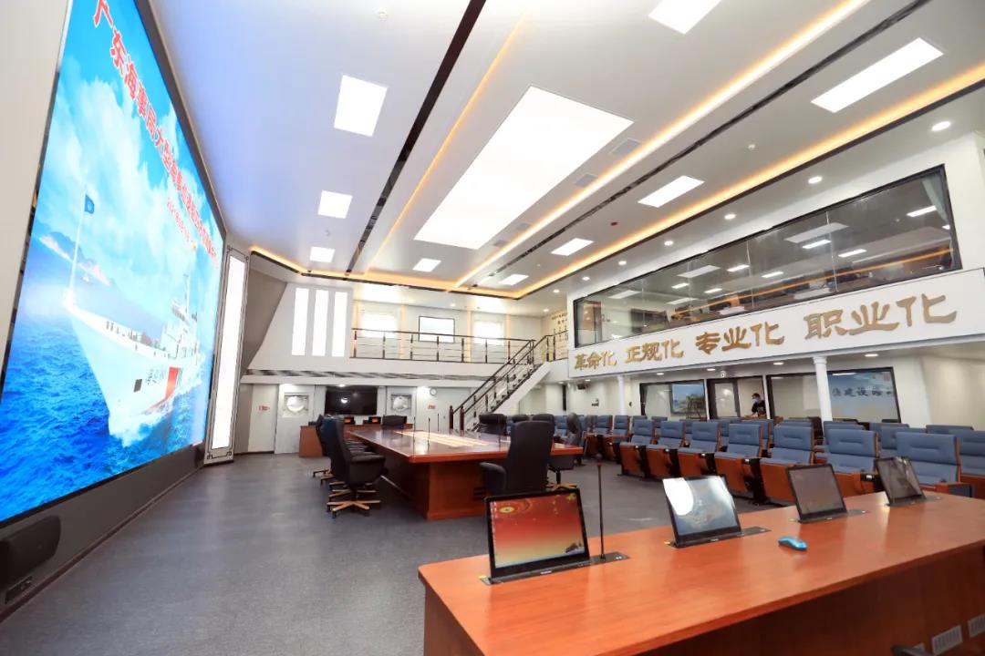 “海巡09”是全球先進的海上綜合指揮平臺,建有海上數據中心和綜合指揮大廳。綜合指揮大廳最吸引人眼球的就是這一塊長8米、高4.55米的大型LED顯示屏。然而這僅只是“海巡09”指揮系統霸氣的外表。事實上,它包括了移動監管指揮平臺等16個子系統,可以通過與包括北斗在內的5套衛星系統進行數據傳輸,實現海上艦船編隊自組網和建立數據集群,并且網絡速度可以達到10兆以上,真正實現“陸海空天”一體化海事管理。