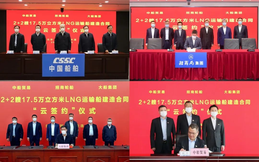 3月31日,中國船舶集團(tuán)有限公司旗下大船集團(tuán)聯(lián)合中船貿(mào)易與招商局集團(tuán)有限公司旗下招商輪船在上海、深圳、大連及北京四地以“云簽約”方式簽署2+2艘17.5萬立方米大型液化天然氣(LNG)運輸船建造合同。中國船舶集團(tuán)黨組書記、董事長雷凡培,黨組副書記、總經(jīng)理楊金成,黨組成員、副總經(jīng)理盛紀(jì)綱,招商局集團(tuán)董事長繆建民、總經(jīng)理胡建華、董事王宏出席簽約儀式。雷凡培、繆建民在儀式上致辭。