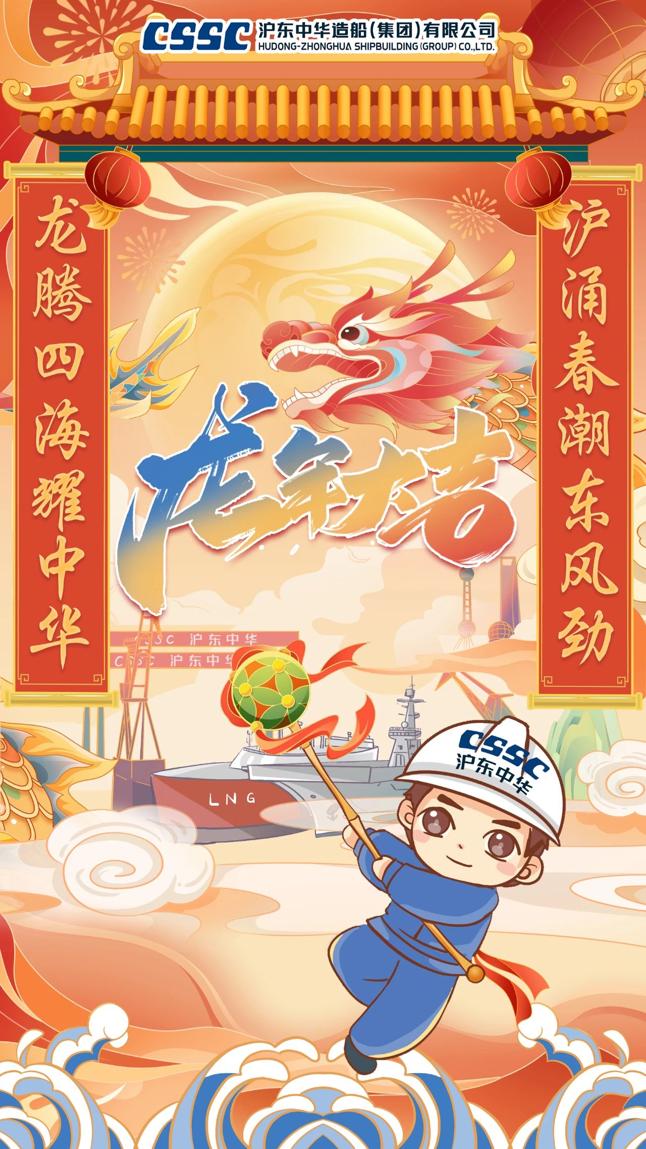 創意說明:海報中“江小南”舞起龍頭,預示著在新的一年,江南造船將賡續努力,龍頭揚起、再創新績!而跟隨舞動的則是目前江南造船在建的集裝箱船、液化氣船和汽車滾裝船等主產品系列。