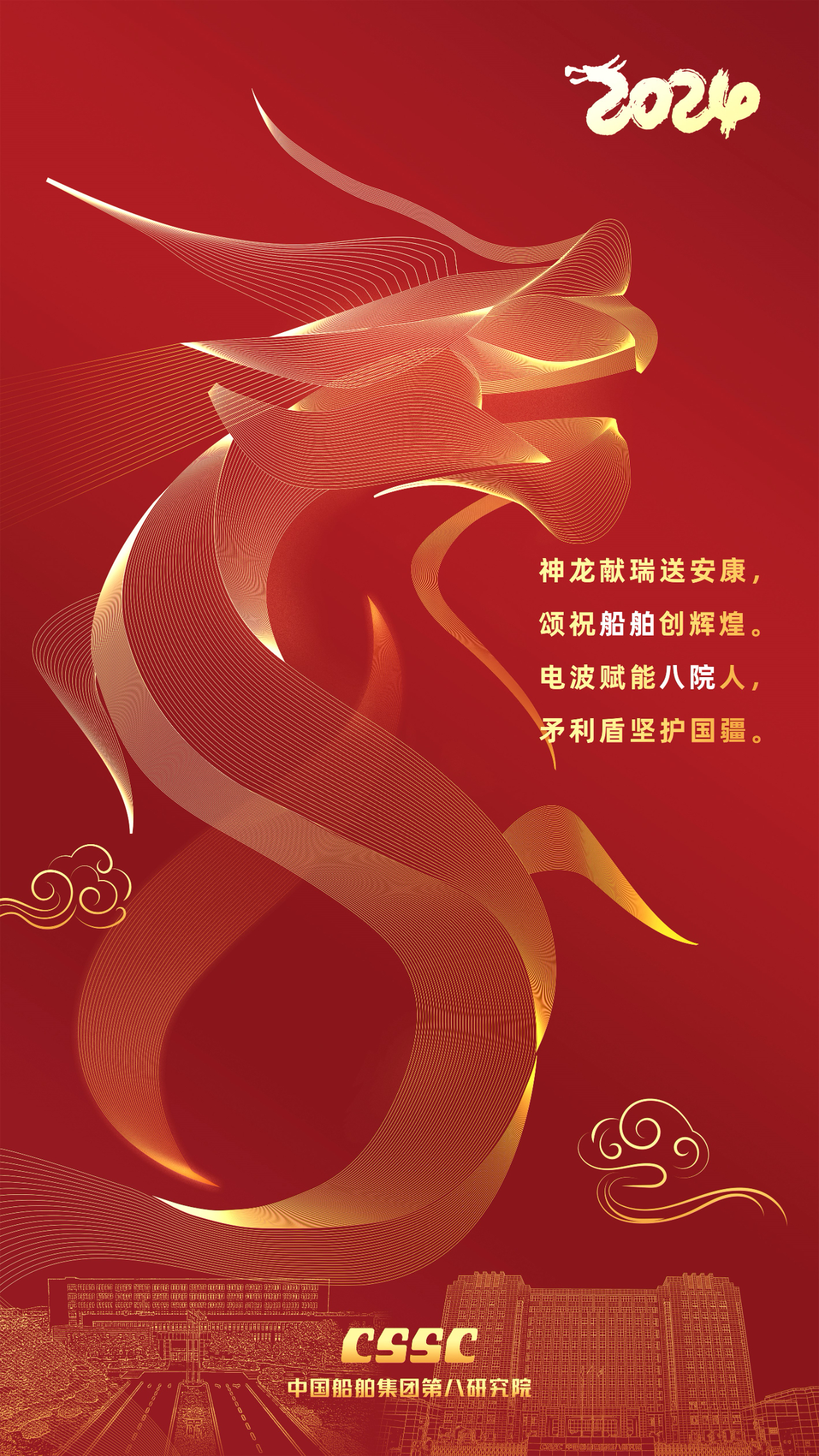 創意說明:海報中龍的花紋是電磁波圖形,體現八院的專業特色;龍的整體造型為8字型,意為八院;兩院區主樓上空飄祥云,寓意祥龍送喜,福照八院!