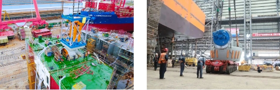 “夢(mèng)想”號(hào)配備的7臺(tái)推進(jìn)器中,3臺(tái)全回轉(zhuǎn)伸縮推是黃埔文沖迄今總成過(guò)的最大伸縮推,并且建造過(guò)程中伸縮推需要進(jìn)行全程升降試驗(yàn),升降高度差達(dá)4.3米。完成試驗(yàn)的伸縮推總段重量超過(guò)了船廠(chǎng)龍門(mén)吊最高900噸的起重能力?!皦?mèng)想”號(hào)工藝負(fù)責(zé)人馮仕清創(chuàng)新性地提出了采用龍門(mén)吊和履帶吊聯(lián)合吊裝的方法,最終保證了伸縮推的成功安裝。