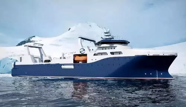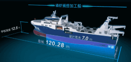 ????“深藍號”由黃埔文沖建造,七〇八所參與設計,總長約120米,型寬21.6米,設計吃水7.3米,設計航速15節,主機功率8000 千瓦,載重噸約5000噸?!吧钏{號”是我國自主研制建造的第一艘漁業捕撈加工一體船,也是目前最大最先進的漁業捕撈加工一體船,取得近200項知識產權保護,實現了我國現代化漁業船舶裝備領域的重大突破,達到世界先進水平;主要用于南大洋漁業捕撈,兼顧海洋科考功能,可滿足ICE-A冰區(冰厚度0.8米)及-25℃低溫環境的營運要求。