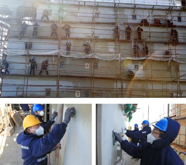 為確保該船按期實(shí)現(xiàn)試航節(jié)點(diǎn),大船集團(tuán)山船重工先后組織150余名黨員干部投入到該船生活區(qū)外板拉毛工程中。黨員們根據(jù)所分配的區(qū)域,站在十幾米高的腳手架上,手里拿著磨砂紙,一點(diǎn)一點(diǎn)地磨,一塊一塊地蹭,不放過(guò)每個(gè)細(xì)節(jié)。