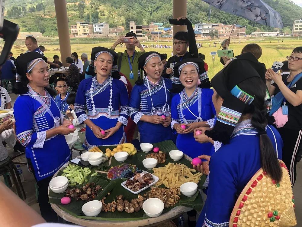 國家繁榮昌盛,人民生活幸福日子甜美。中午時分,現場壯鄉長桌簸箕宴盛裝開席。喜悅的群眾對造型精巧、美妙絕倫的桑秋花米飯及平寨特色美食贊不絕口。一個個簸箕盛放的不僅是原生態健康美味,更是丘北壯鄉沉淀千年的魅力文化象征。