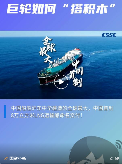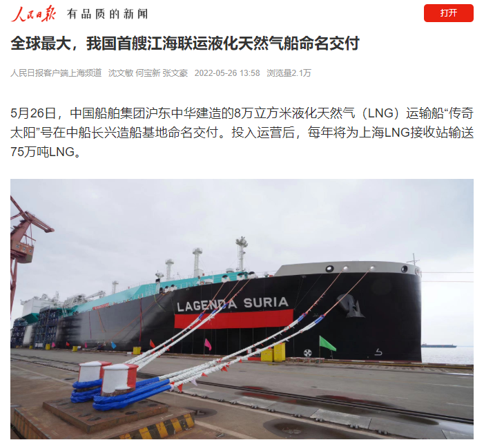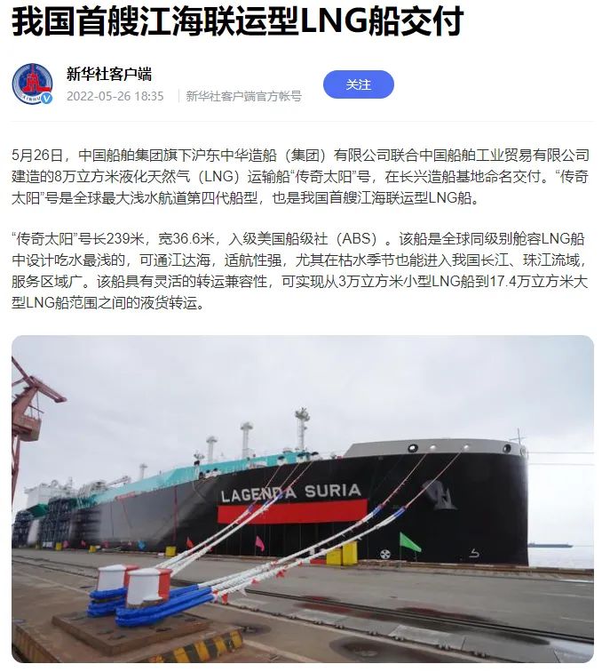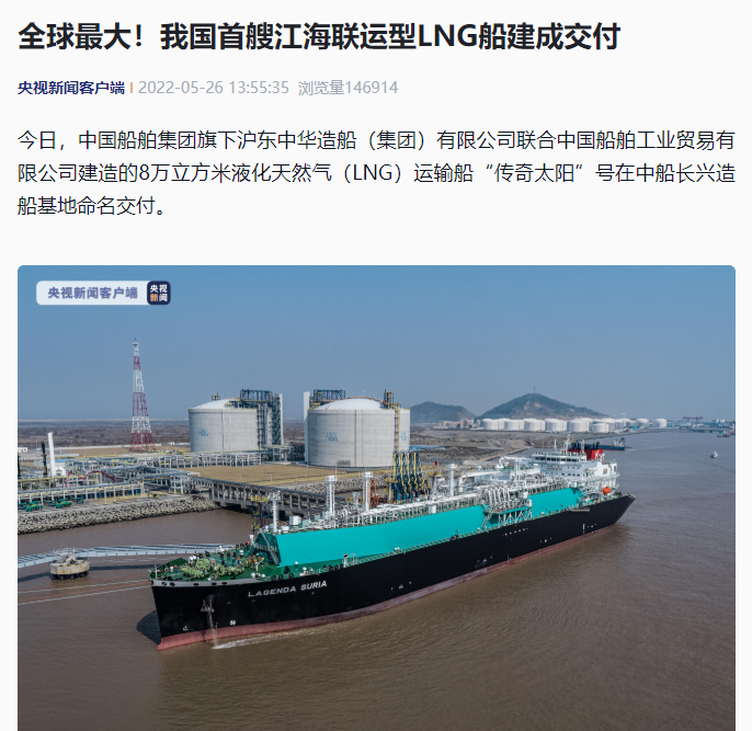 央視新聞聚焦、人民日?qǐng)?bào)關(guān)注!全球最大,我國(guó)首艘江海聯(lián)運(yùn)型LNG船命名交付