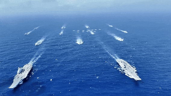在南海某海域,遼寧艦、山東艦編隊(duì)首次開展雙航母編隊(duì)演練,錘煉提升航母編隊(duì)體系作戰(zhàn)能力